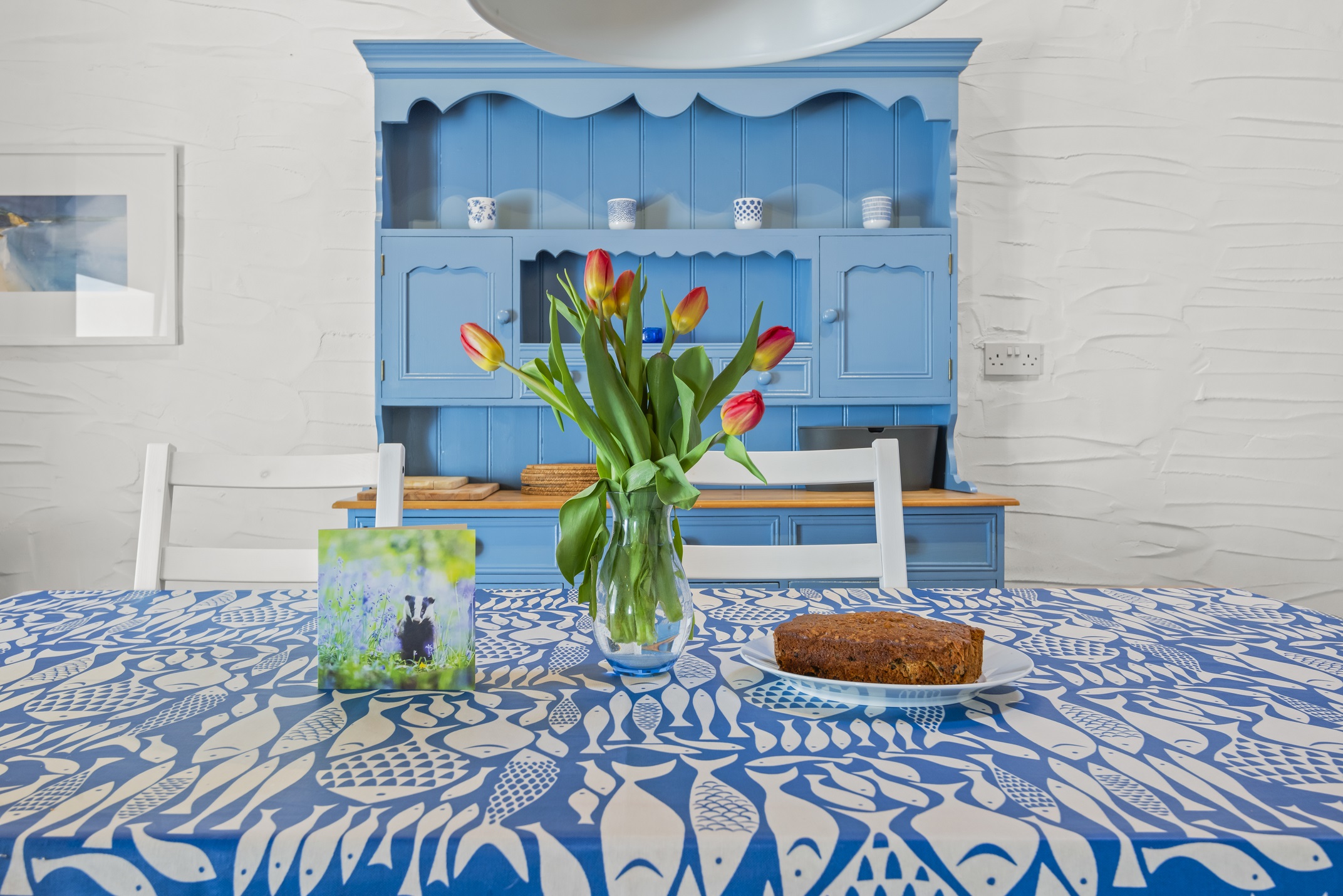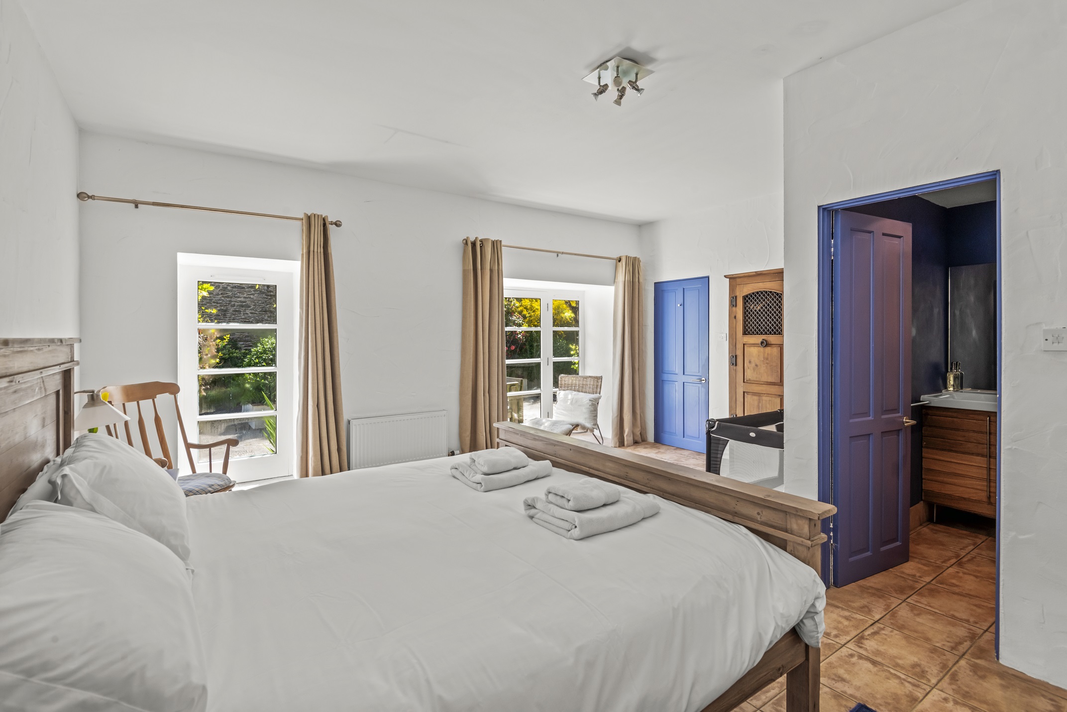 An 'upside down' Devon barn with a vast, beamed living space upstairs including a modern kitchen and a woodburner. Downstairs there are two cosy bedrooms, both en suite. One can be made as a twin or a superking, the other has a super-kingsize bed and plenty of room to add a cot if needed.