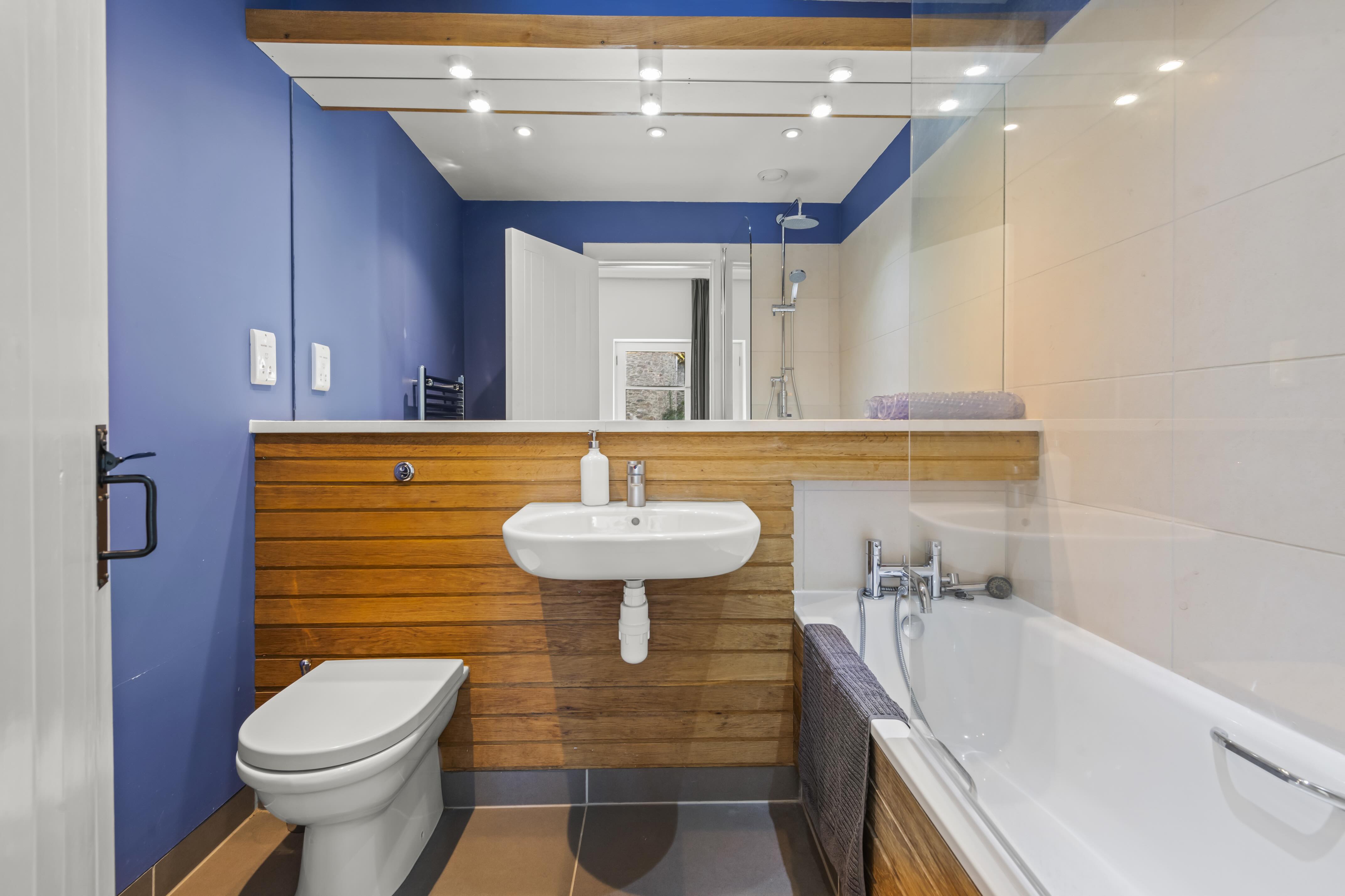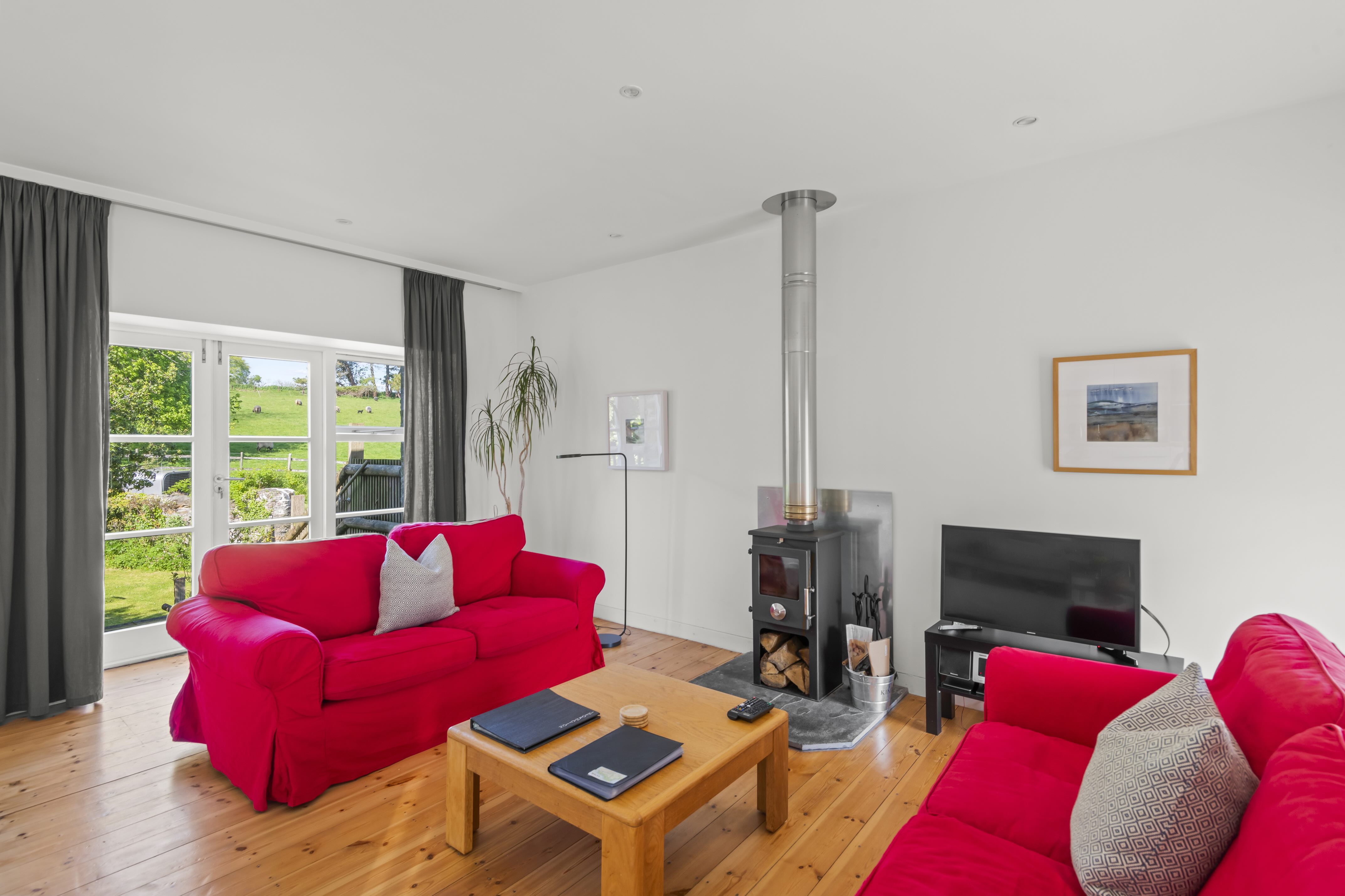 A historic barn with a modern, gallery-style interior and a garden all of its own. Open plan living upstairs, with a woodburner for the winter, or throw the doors open in the summer and enjoy the garden and views beyond. Two bedrooms downstairs, both with modern en-suites. One can be a twin or a double, the other has a super-kingsize bed. >